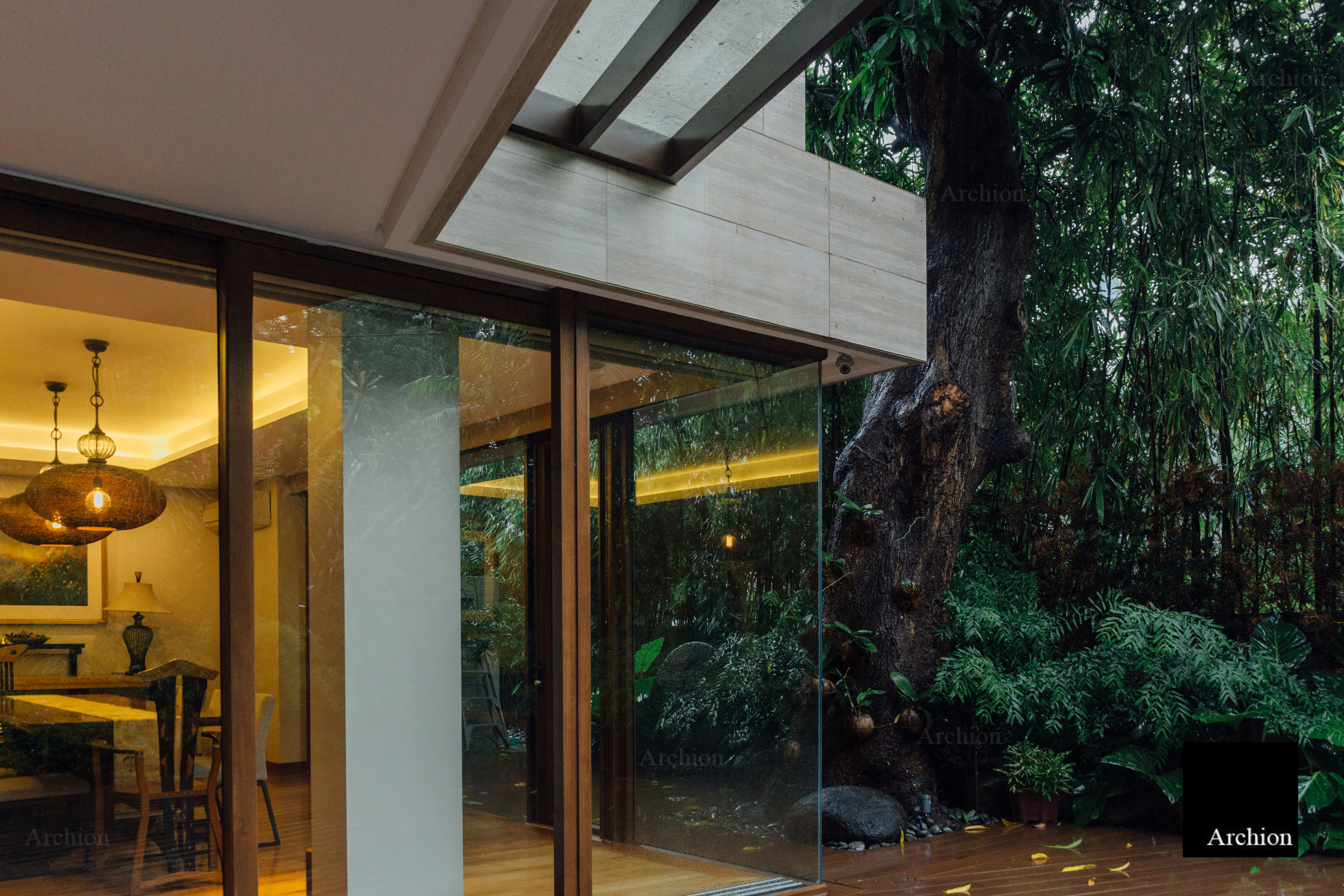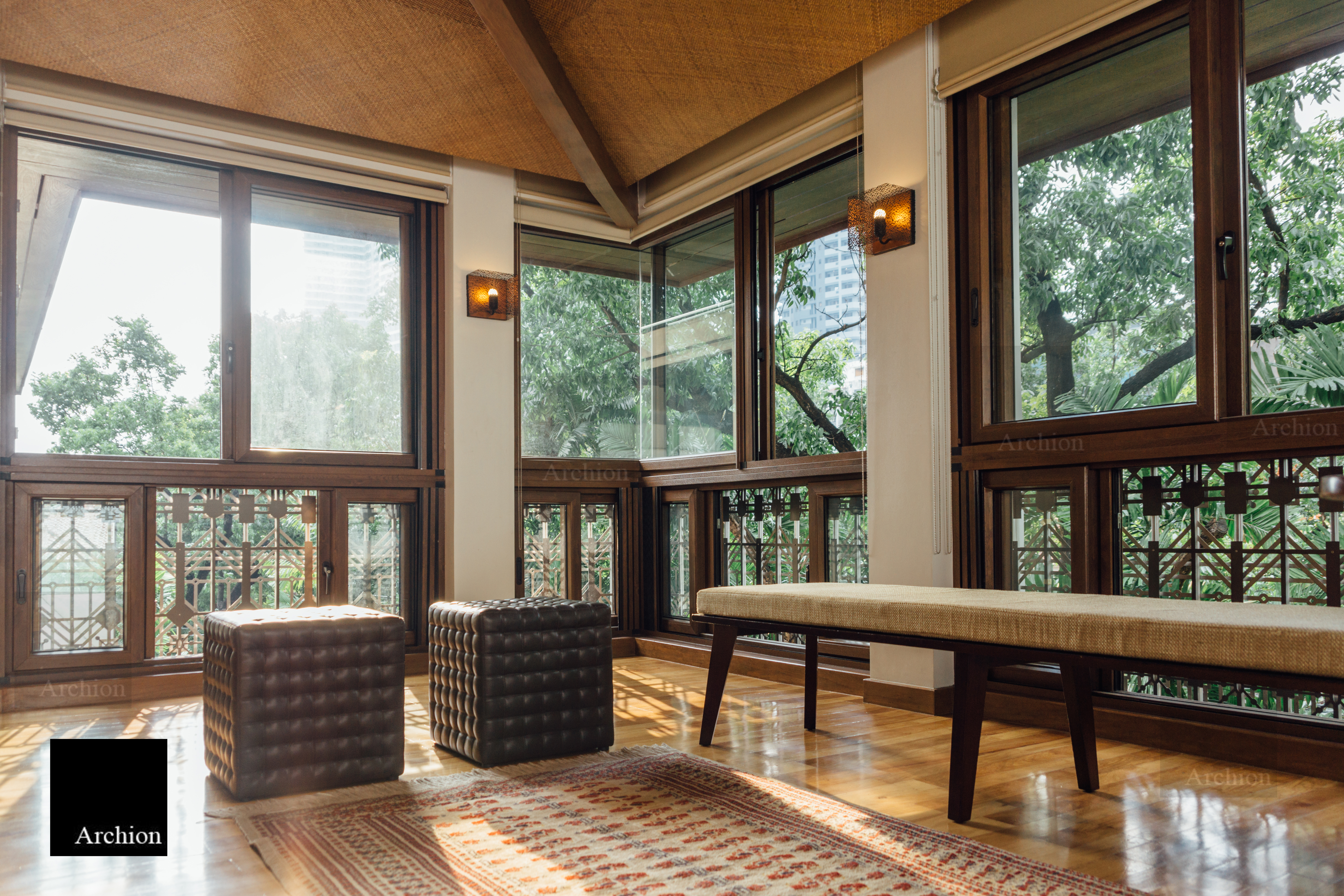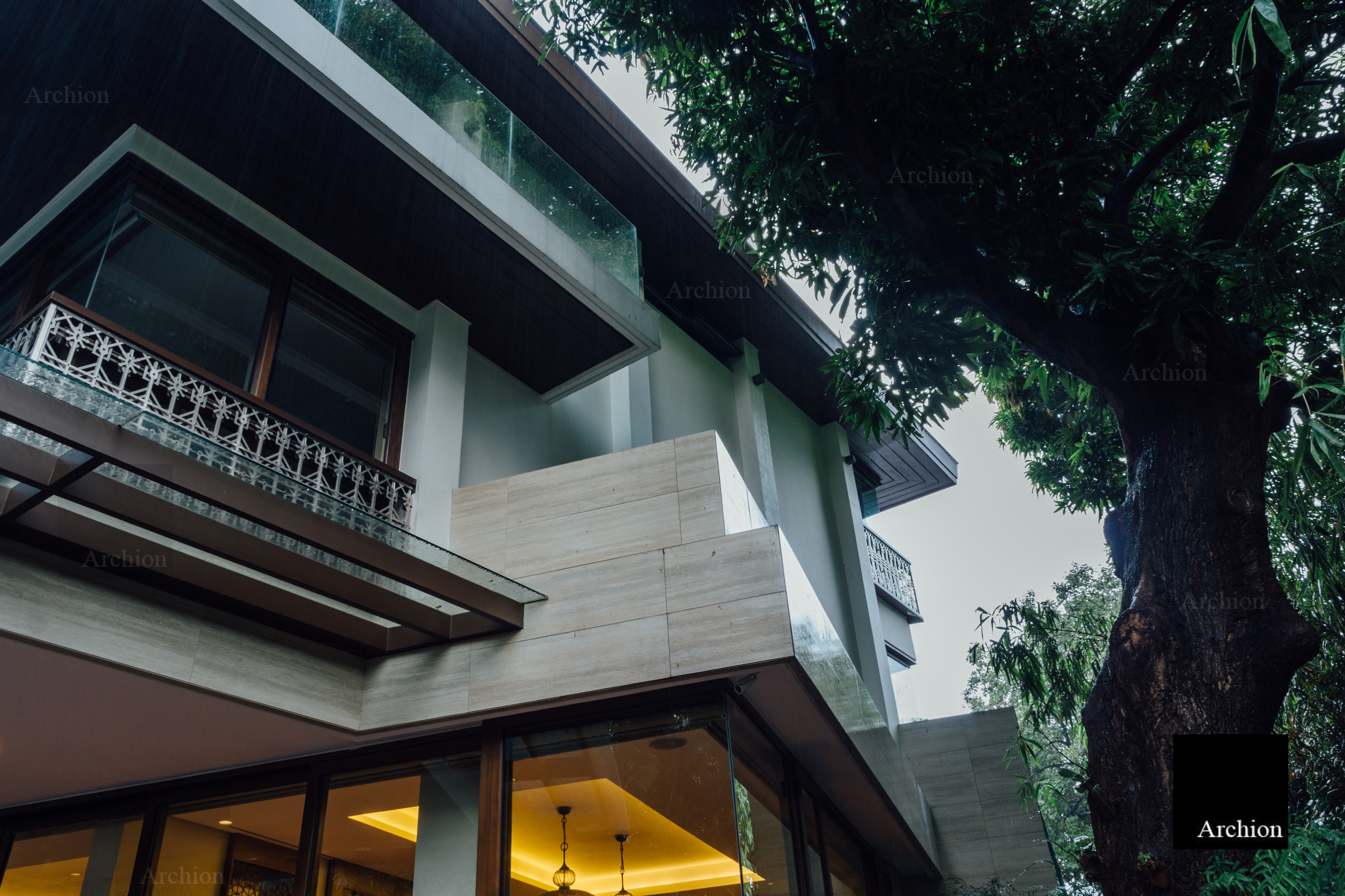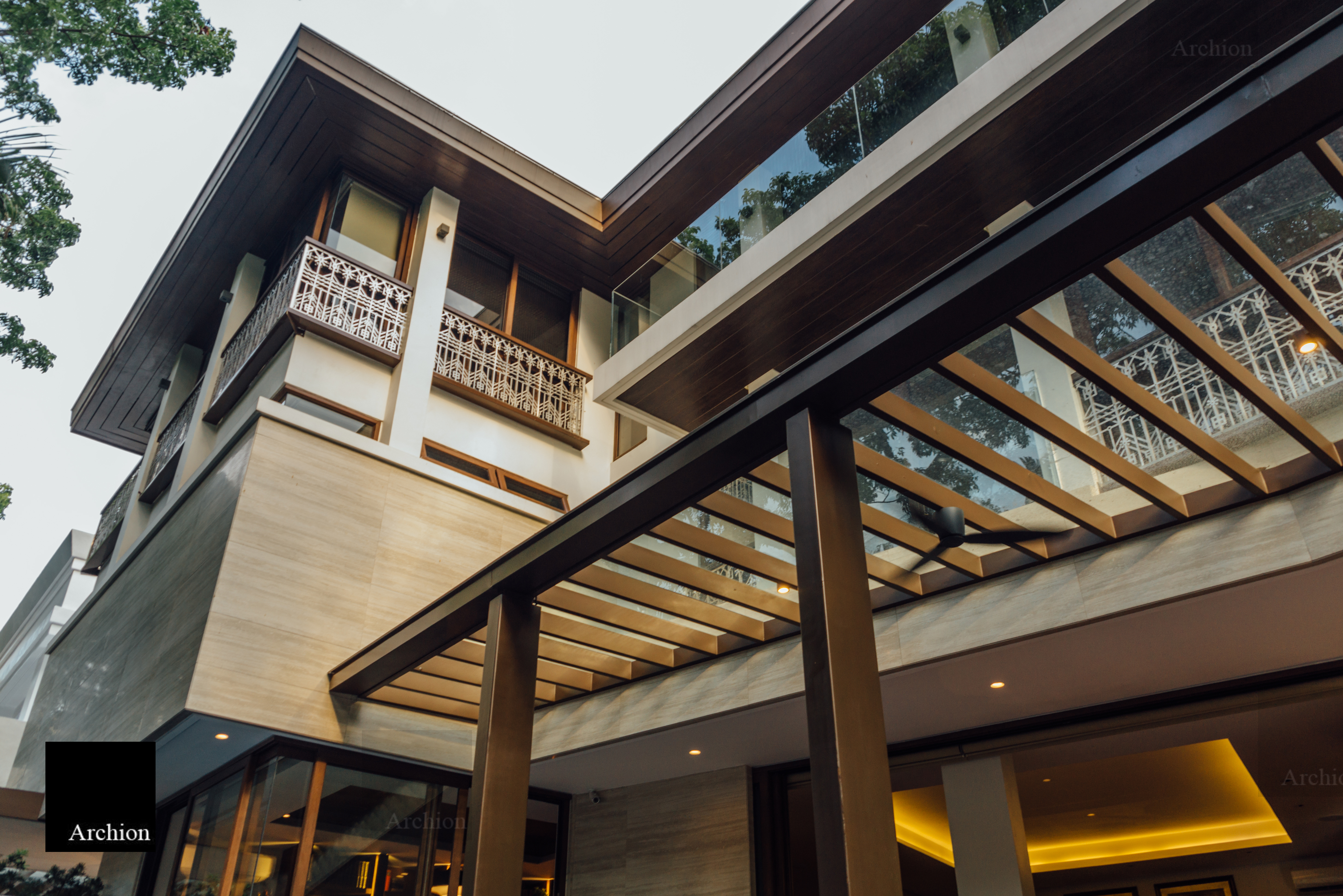 A modern interpretation of the bahay na bato, a distinctive Filipino structure, the Arnaiz Residence is a three-story home in Makati that stays true to the bahay kubo's architectural essence and is built to withstand the tropical climate and earthquake-prone environment. The design presents answers to tropical architectural challenges such ventanillas, lengthy roof eaves, and elevated living areas. Ventanillas are placed beneath the main fenestration to allow for natural ventilation and create shadow patterns mimicking the local weaving art of paghahabi, the long roof eaves offer adequate shade to lower the temperature, allowing less reliance on artificial cooling, and the structure is lifted from the ground for flood protection. Classical and contemporary materials such as travertine tiles, steel cut-outs, and glass were used for a modern Filipino aesthetic that is authentic and faithful to its roots.