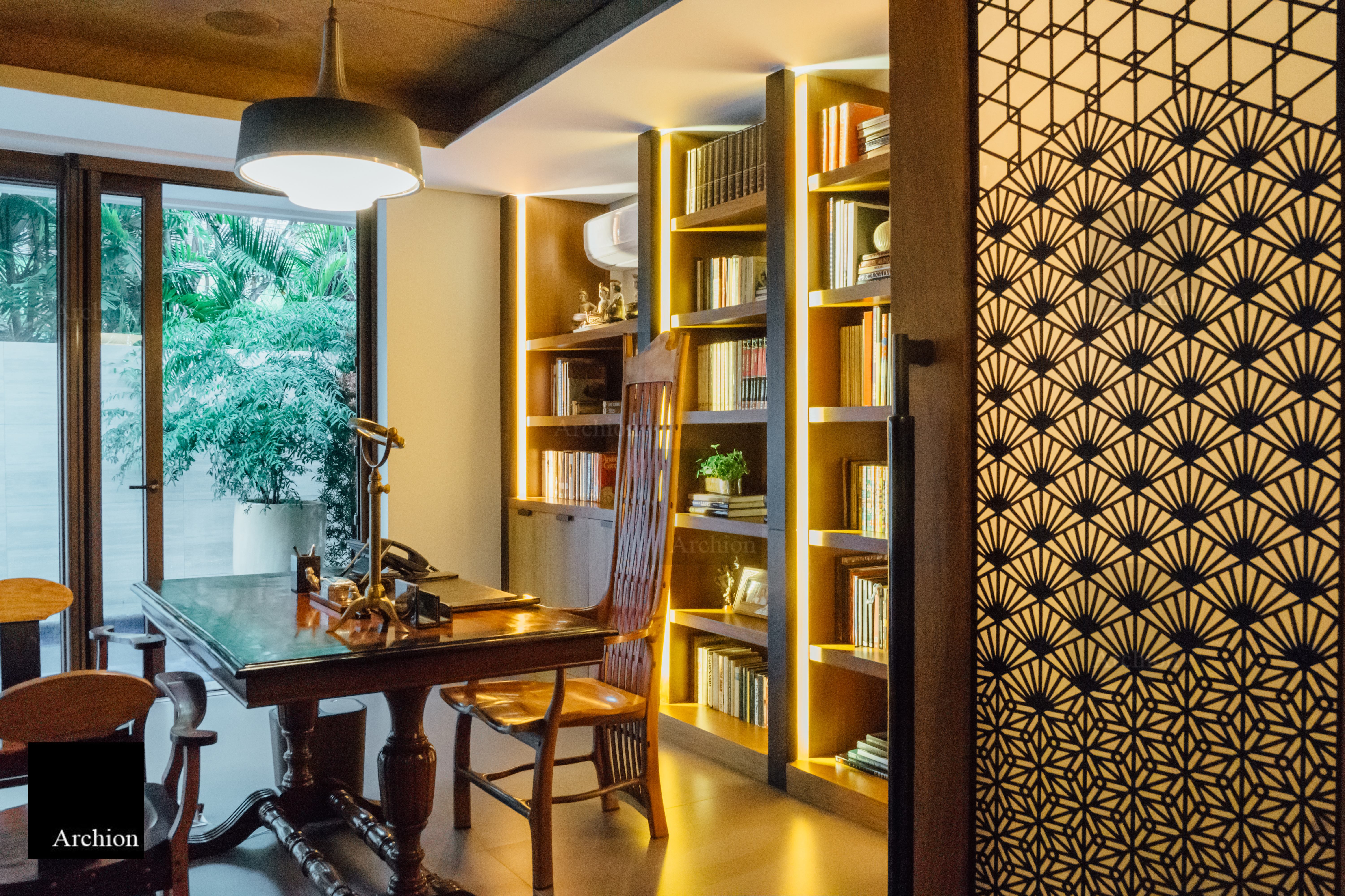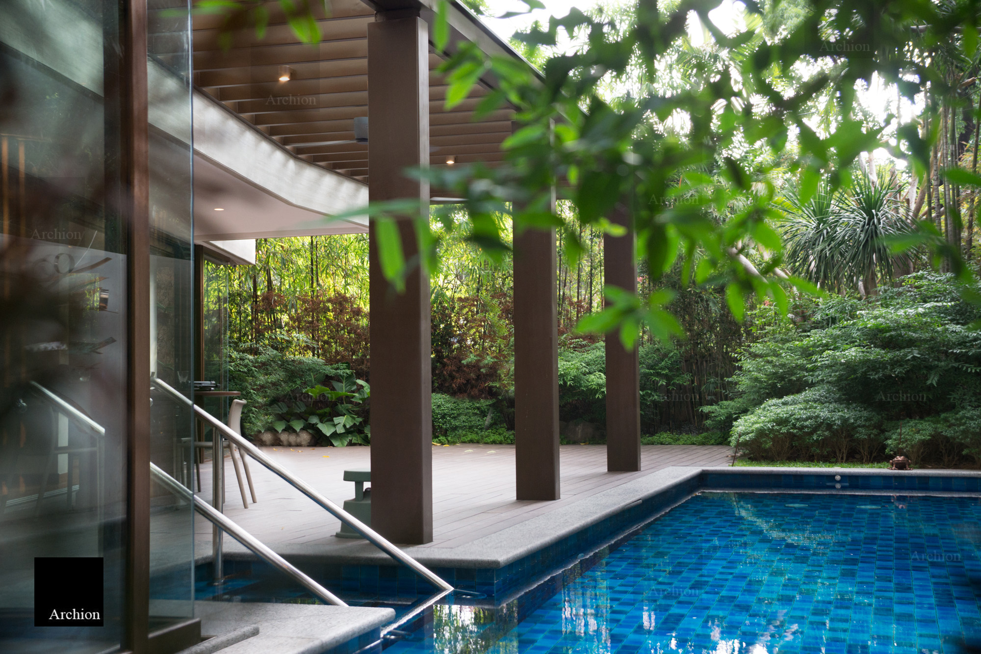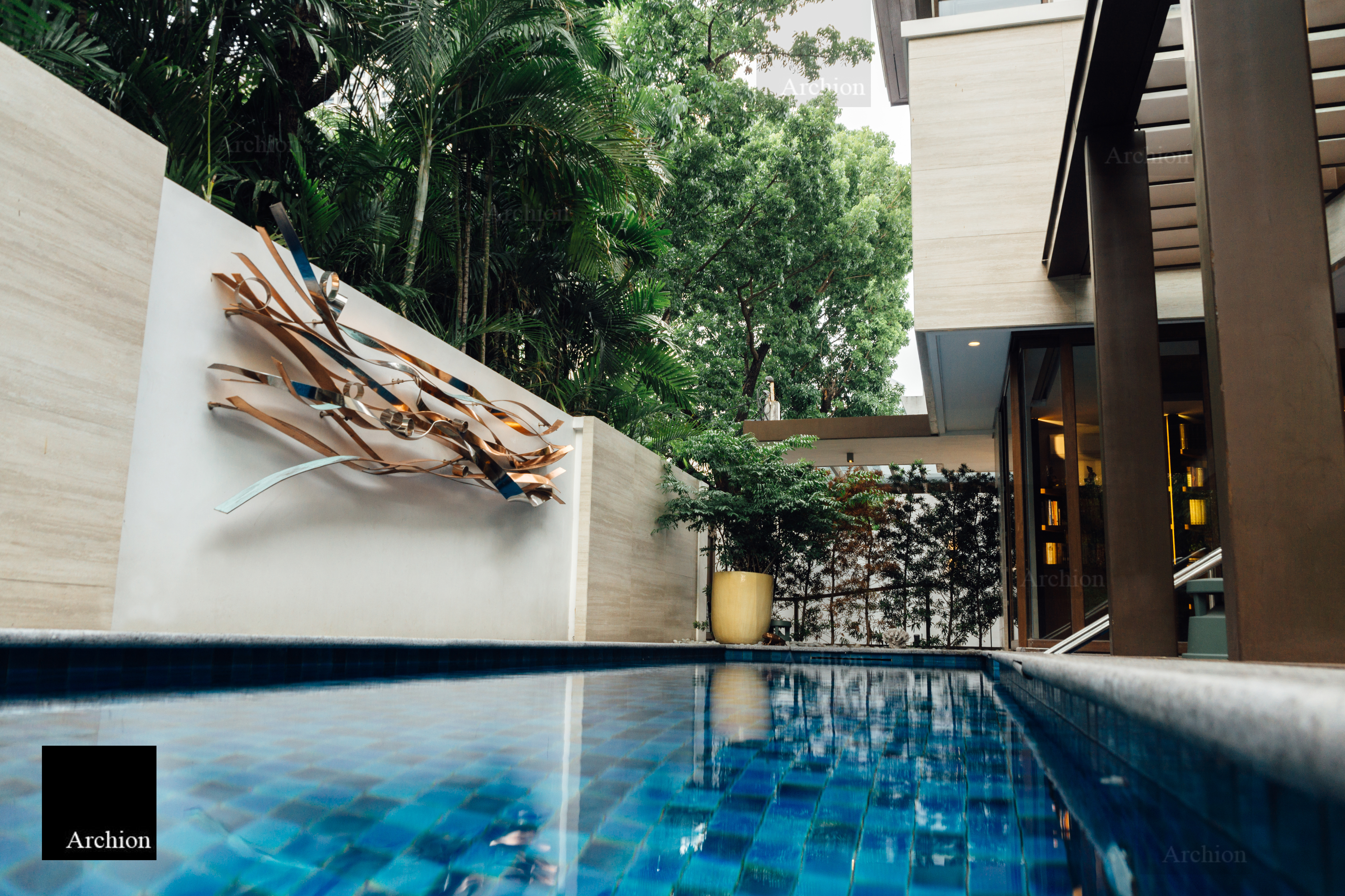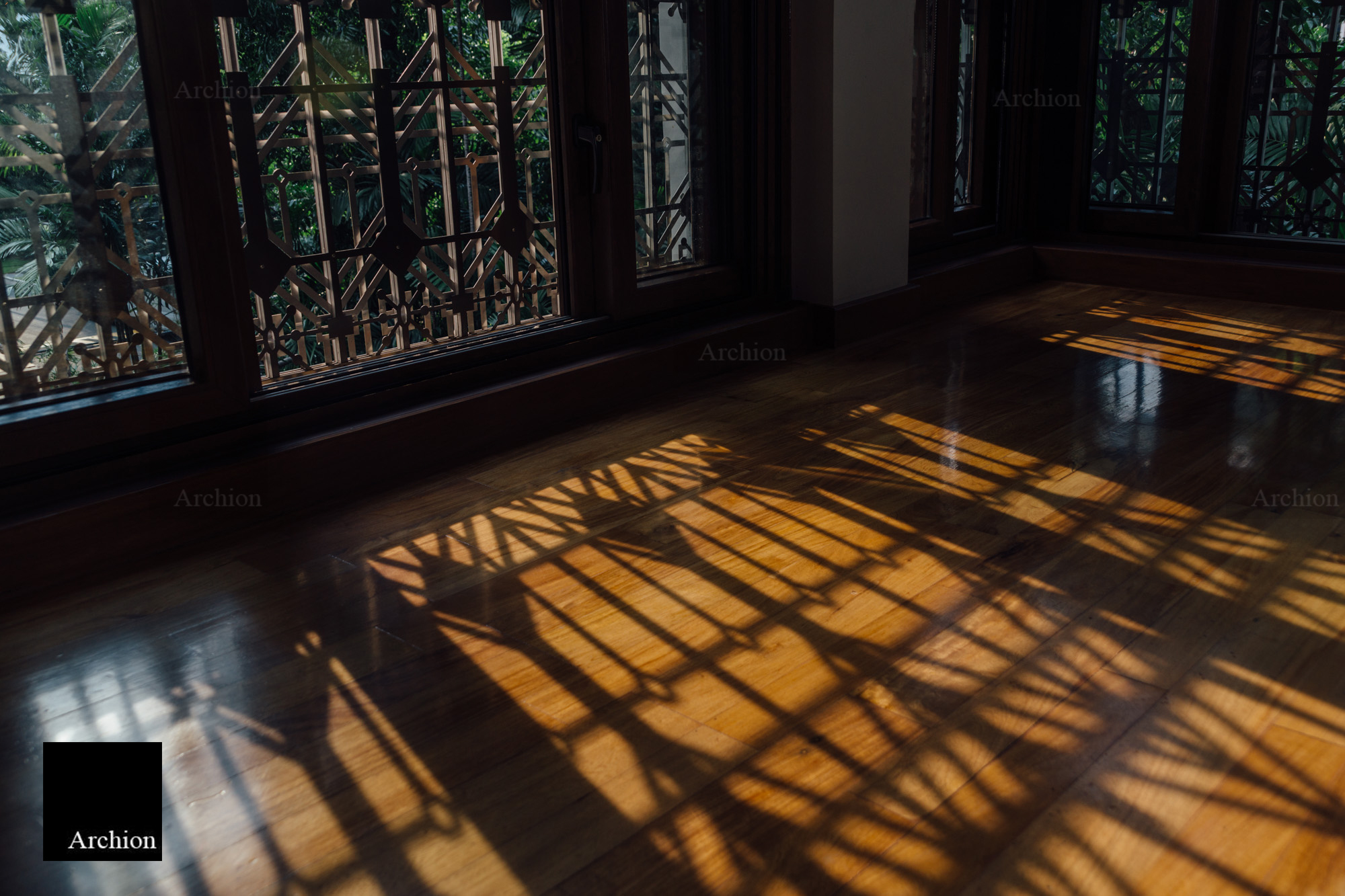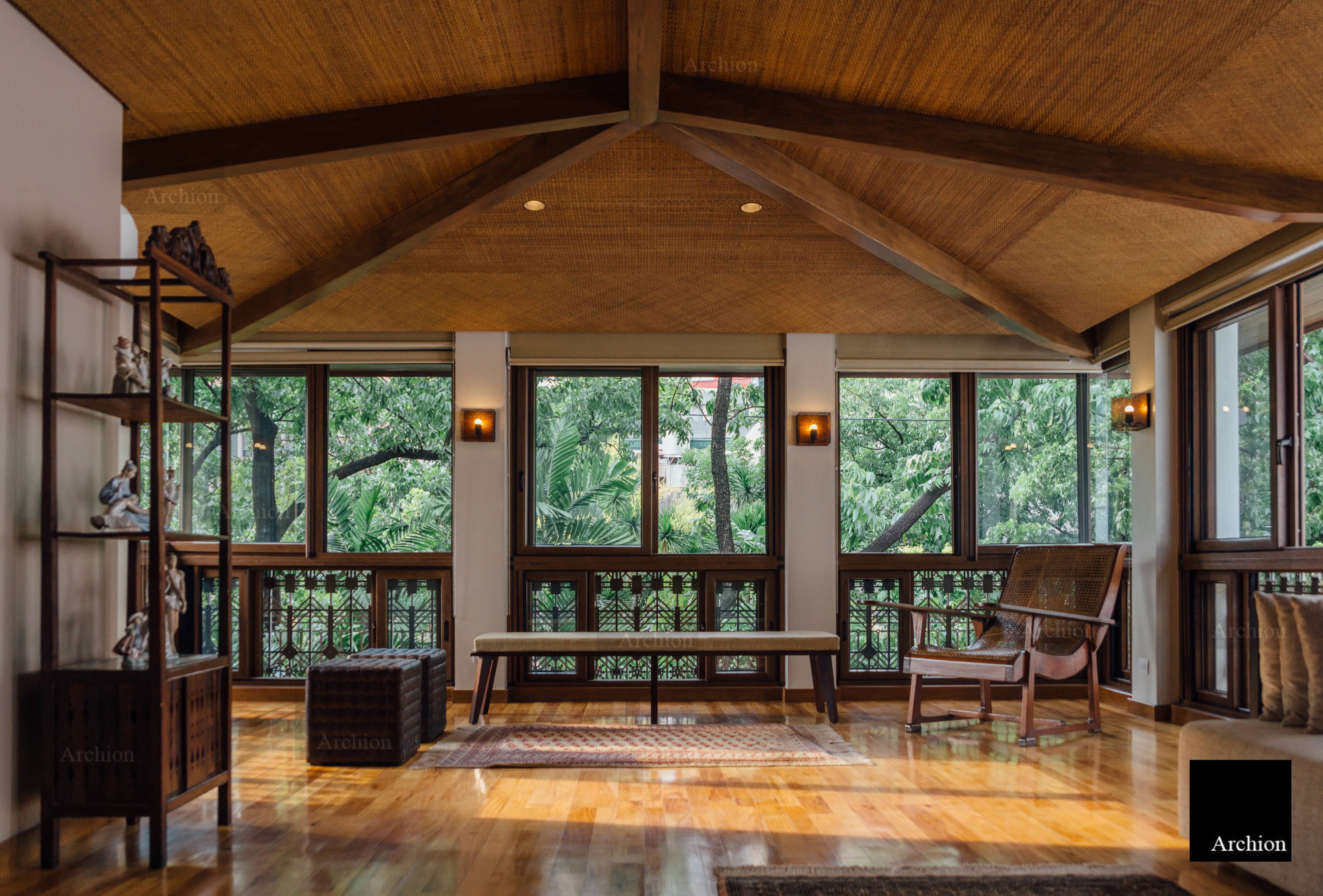 A modern interpretation of the bahay na bato, a distinctive Filipino structure, the Arnaiz Residence is a three-story home in Makati that stays true to the bahay kubo's architectural essence and is built to withstand the tropical climate and earthquake-prone environment. The design presents answers to tropical architectural challenges such ventanillas, lengthy roof eaves, and elevated living areas. Ventanillas are placed beneath the main fenestration to allow for natural ventilation and create shadow patterns mimicking the local weaving art of paghahabi, the long roof eaves offer adequate shade to lower the temperature, allowing less reliance on artificial cooling, and the structure is lifted from the ground for flood protection. Classical and contemporary materials such as travertine tiles, steel cut-outs, and glass were used for a modern Filipino aesthetic that is authentic and faithful to its roots.